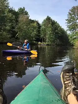 The town is 38.4 square miles (99.5 km2), of which 38.0 square miles (98.5 km2) are land and 0.42 square miles (1.1 km2) (1.06%) are water.[1] Peterborough is drained by the Contoocook River and its tributaries, Nubanusit Brook and Otter Brook. The entire town is part of the Merrimack River watershed. The highest point in Peterborough as well as in Hillsborough County is the summit of South Pack Monadnock (2,290 feet (698 m) above sea level), in Miller State Park in the southeast corner of town. Peterborough is also home to Edward MacDowell Dam and Lake recreation area, where visitors can walk across the dam, hike, cross-country ski, swim, boat, picnic, play Frisbee golf, play horseshoes, and take advantage of other recreational opportunities, many of them accessible to people with disabilities. The town is crossed by U.S. Route 202 and Route 101.
