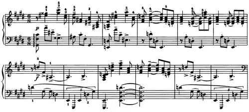 The work features one of the strange occurrences of the complete mystic chord spelled in fourths (mm. 264 and 268). Jim Samson[9] points out that it fits in well with Scriabin's predominantly dominant quality sonorities and harmony as it may take on a dominant quality on C or F♯. This tritone relationship between possible resolutions is important to Scriabin's harmonic language, and it is a property shared by the French sixth (also prominent in his work).