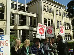Informational picketing is the legal name given to awareness-raising picketing. Per Merriam-Webster's Dictionary of Law, it entails picketing by a group, typically a labour or trade union, which inform the public about a cause of its concern.[2] In almost all cases this is a disliked policy or practice of the business or organisation. It is a popular picketing technique for nurses to use outside of healthcare facilities. For example, on April 5, 2006, nurses of the UMass Memorial Medical Center (UMMHC) took part in two separate such events to protect the quality of their nursing program.[3] Informational picketing was used to gain public support and promote further bargaining with management.[3] It may also be a spur or auxiliary to a petition to government to seek regulatory intervention, reliefs, dispensations or funds.