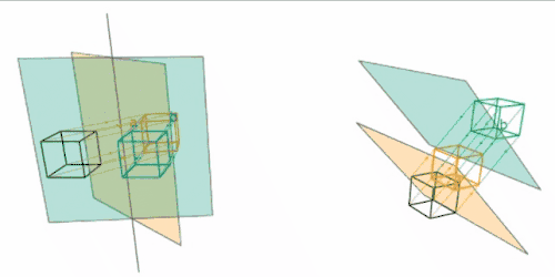2. The Projective dual also maps planes to points, but it is not the case that both are reflections; instead, the projective dual switches between the space that plane-based geometric algebra operates in and a non-euclidean (but neither hyperbolic nor elliptic) space discussed by Klein.[17] For example, planes in plane-based geometric algebra, which perform planar reflections, are mapped to points in dual space which are involved in non-trivial transformations known as collineations. Therefore, and cannot both be drawn in familiar Euclidean space. Different authors have termed the plane-based GA part of PGA "Euclidean space"[18] and "Antispace".[9]