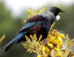 A tūī, a New Zealand native bird species, will stick its beak inside a flower to eat the nectar deep within the petals in order to extract vital nutrition they need to survive.[10] Flowers native to New Zealand have evolved alongside these birds in order to best deposit pollen onto them while they extract nectar, usually depositing it on the upper or underside of the beak. The tūī then moves on to another flower and will cross pollinate them completing the cycle in a mutually beneficial relationship.[10]