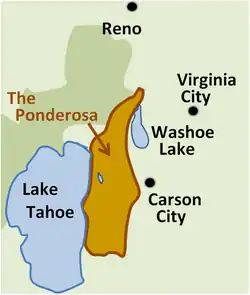 The Ponderosa was the fictional setting for Bonanza. According to the 9th episode ("Mr. Henry Comstock") in the first season, it was a thousand-square mile (640,000 acre or 2,600 km2) ranch on the shores of Lake Tahoe, nestled high in the Sierra Nevada, with a large ranch house in the center of it.[1] Ben Cartwright was said to have built the original, smaller homestead after moving from New Orleans with his pregnant third wife Marie and his two sons, Adam and Hoss. The grown Adam, an architect/engineer, designed the later sprawling ranch house as depicted on TV ("Bonanza, The Philip Diedesheimer Story", Oct. 31, 1959, NBC-TV; Bonanza: The Return, April 1993, NBC-TV). The fictional ranch was roughly a two-hour horse ride from Virginia City, Nevada. (Note: There are slight variations as to the origin of the Ponderosa Ranch, from the original Bonanza series, Lorne Greene's 1964 song "Saga of the Ponderosa", the 1988–95 TV movies, and the 2001 PAX prequel series Ponderosa). The ranch house was a single-level structure that had a facade second storey. Inside, a staircase seemingly led to the second-floor corridor, but it was a dead end. The bedroom scenes were filmed at Burbank Studios. David Dortort, the show's producer, said that the inspiration for the name was the large number of Ponderosa pines, which grow above 5,000 foot altitude, in the fictional ranch's location. A Latin derivation would be large (root of the English word ponderous). The exteriors for the television show were occasionally shot in Nevada, usually out of sequence. Crews were sometimes able to complete an entire season's work in just a few days.