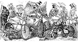 Satirical print by José Guadalupe Posada with bicyclists labeled with the names of Mexico City newspapers
