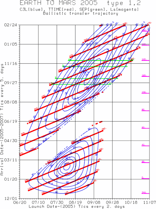 Representative porkchop plot for the 2005 Mars launch opportunity (horizontal axis: departure dates in mm/dd notation, vertical axis: arrival dates (mm/dd))