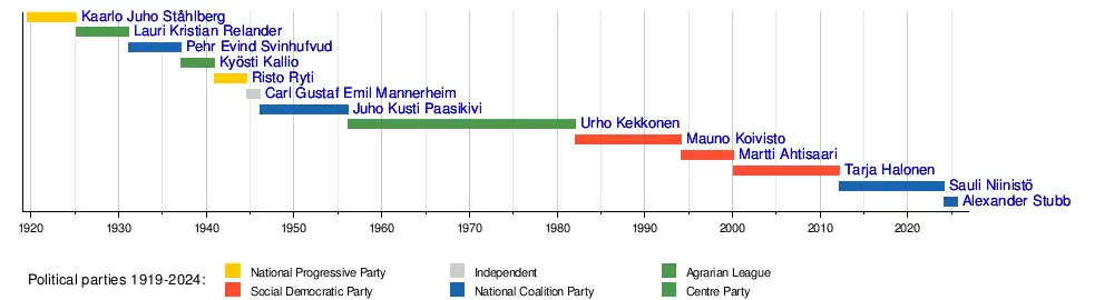 - ^ Pekkarinen, Virpi (15 February 2024). "President of the Republic of Finland to be inaugurated on 1 March 2024". Tasavallan presidentti Sauli Niinistö. Retrieved 19 January 2025.
