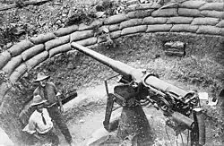 The 12 pounder 12 cwt anti-aircraft gun was a British anti-aircraft gun of the First World War, The guns were QF 12 pounder 12 cwt naval guns taken from coast defence positions with the addition of a modified cradle for higher elevation, a retaining catch for the cartridge, and an additional spring recuperator above the barrel and high-angle sights. Writers commonly refer to it simply as "12 pounder anti-aircraft gun". 12 cwt referred to the weight of the barrel and breech - 1,344 lb (610 kg) - to differentiate it from other 12-pounder guns.