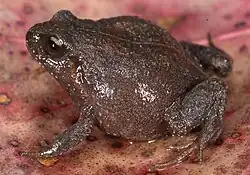 The species has rough (shagreen) skin on its back and smooth skin on its belly.[3] It has an tympanic membrane (eardrum) and a tympanic annulus, as well as a vocal sac with vocal slits.[3] The back can be reddish brown, grayish brown, purplish brown, or dark gray; the belly can be dark brown, tan, or reddish brown with pale grey flecks.[3] The frogs has also have narrow, tan mid-dorsal strips running down the middle of their backs.[3] Its advertisement call is a single, short note repeated at regular intervals.[3]