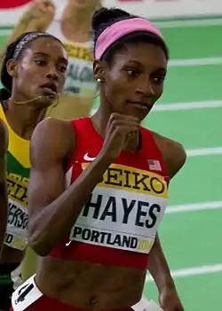 Quanera Hayes ( kwə-NEER-ə; born March 7, 1992)[2] is an American sprinter specializing in the 400 meters distance.[3] She won the bronze medal at the 2016 World Indoor Championships and is the 2020 US Olympic Trials champion in the women's 400 m. She has earned several gold medals for the United States in the 4 × 400 m relay, including at the World Championships and World Relays in 2017, as well as the World Indoor Championships in 2016, 2018 and 2025. She is a 400 m 2021 Diamond League champion.