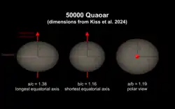 Quaoar's far-infrared thermal emission and brightness in visible light both vary significantly (visible light curve amplitude 0.12–0.16 magnitudes) as Quaoar rotates every 17.68 hours, which most likely indicates Quaoar is elongated along its equator.[6] A 2024 analysis of Quaoar's visible and far-infrared rotational light curve by Csaba Kiss and collaborators determined that the lengths of Quaoar's equatorial axes differ by 19% (a/b = 1.19) and the lengths of Quaoar's polar and shortest equatorial axis differ by 16% (b/c = 1.16), which corresponds to ellipsoid dimensions of 1,286 km × 1,080 km × 932 km (799 mi × 671 mi × 579 mi).[a][6] The ellipsoidal shape of Quaoar matches the size and shape measurements from previous stellar occultations, and also explains why the size and shape of Quaoar appeared to change in these occultations.[6]: 6