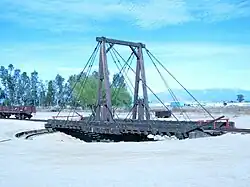 A small turntable at the Orange Empire Railway Museum in Perris, California, US. This type of turntable with the central tower and supporting cables is called a "gallows turntable"