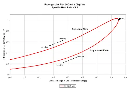 The above equation can be manipulated to solve for M as a function of H. However, due to the form of the T/T* equation, a complicated multi-root relation is formed for M = M(T/T*). Instead, M can be chosen as an independent variable where ΔS and H can be matched up in a chart as shown in Figure 1. Figure 1 shows that heating will increase an upstream, subsonic Mach number until M = 1.0 and the flow chokes. Conversely, adding heat to a duct with an upstream, supersonic Mach number will cause the Mach number to decrease until the flow chokes. Cooling produces the opposite result for each of those two cases. The Rayleigh flow model reaches maximum entropy at M = 1.0 For subsonic flow, the maximum value of H occurs at M = 0.845. This indicates that cooling, instead of heating, causes the Mach number to move from 0.845 to 1.0 This is not necessarily correct as the stagnation temperature always increases to move the flow from a subsonic Mach number to M = 1, but from M = 0.845 to M = 1.0 the flow accelerates faster than heat is added to it. Therefore, this is a situation where heat is added but T/T* decreases in that region.