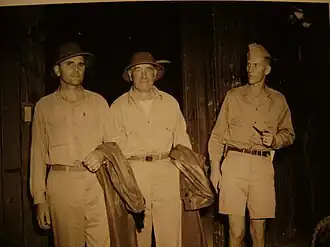 (L-R) Cdr. W.R. Specht, Commodore Edward 'Mike' Moran, and LCdr. R.B. Kelly at Rendova, May 1944