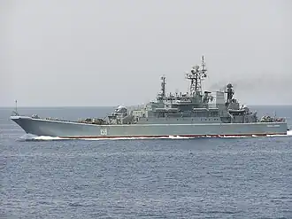 Tsezar Kunikov (BDK-64) (Russian: «Цезарь Куников» (БДК-64); NATO reporting name: Ropucha-I class), sometimes anglicised as Caesar Kunikov, was a Project 775, large landing ship of the Russian Navy. The ship was built in Polish People's Republic, launched in 1986 and named after Soviet Naval Infantry officer Tsezar Kunikov. As part of the Russian Black Sea Fleet, it took part in the KFOR mission, the Russo-Georgian War, the Syrian Civil War, and the Russo-Ukrainian War.