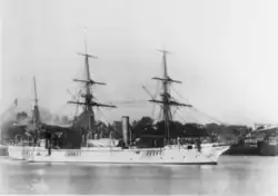 Möwe laid down at the Schichau-Werke shipyard in Elbing in 1878 under the contract designation "C",[a] and was launched on 8 October 1879. Work on the ship was completed at Danzig the following year, and she was commissioned on 31 May 1880 to be moved to Kiel, under the command of Korvettenkapitän (KK—Corvette Captain) Franz von Kyckbusch. There, her guns were installed between 10 and 28 June. She then completed a short period of sea trials, and following their conclusion, she was decommissioned on 17 July. Her time out of service proved to be brief, as on 1 October, Möwe was recommissioned to join her sister ship Habicht in the Australian Station. She was again captained by Kyckbusch. The ship sailed from Kiel on 17 October,[8][9] and on 28 October 1880, Möwe was driven into the British schooner Rescue at Plymouth, Devon, United Kingdom. The schooner was severely damaged at the bow. Möwe lost her bowsprit and topsail yard.[10] Möwe continued on south through the Atlantic, stopping in Funchal, Madiera, and then Rio de Janeiro, Argentina, on the way. She arrived in Cape Town, South Africa, on 2 January 1881. There, she met Habicht and the two vessels sailed together the rest of the way to Melbourne, Australia.[11]