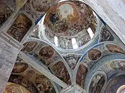 During the collapse in the 15th century the northern wall survived the best. All other walls were partially destroyed (the southern wall suffered the most of all), and, in particular, much of the stone carving from the exterior of the cathedral was torn in pieces. Although at the time the exterior stone carving were considered to be out-of-fashion, Yermolin during the restoration works made attempts to put the stories together. In particular, he was able to put together two stones with the Holy Trinity image in the south portal.[2] However, since there were panoramic images of the whole surface of the cathedral prior to the collapse, and many of the carved stones were destroyed, Yermolin was not able to identified all the stories, and put many stones in random order. Some of the stories were actually used for construction, and their carvings were buried inside the walls; other stones landed in neighboring farms. Some of the latter were later recovered by Pyotr Baranovsky during the Soviet times renovation. Currently, most of the original carvings have been reconstructed on paper.