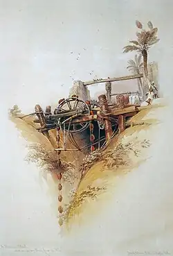 A sāqiyah or saqiya (Arabic: ساقية), also spelled sakia or saqia) is a mechanical water lifting device. It is also called a Persian wheel, tablia, rehat, and in Latin tympanum.[1] It is similar in function to a scoop wheel, which uses buckets, jars, or scoops fastened either directly to a vertical wheel, or to an endless belt activated by such a wheel. The vertical wheel is itself attached by a drive shaft to a horizontal wheel, which is traditionally set in motion by animal power (oxen, donkeys, etc.) Because it is not using the power of flowing water, the sāqiyah is different from a noria and any other type of water wheel.