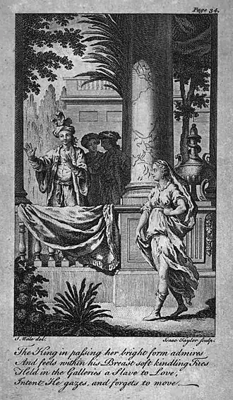 Phelps finds evidence for this judgement in Croxall's evident fascination with the poetry of Spenser, but Croxall was only one of several following the example of Prior's 1706 "Ode, Humbly Inscrib'd to the Queen". All that can be claimed for him is that his imitation is closer to the original and the ancestor of later works claiming to be new additions to the Faerie Queene.[18] The only other poem manifesting some degree of originality is The Fair Circassian which Croxall describes in his preface as "a kind of opera or dramatic performance". The model he had in mind was Handel's recently performed and very successful pastoral opera Acis and Galatea, to a text written by the poets John Gay and (possibly) Alexander Pope. Written at a time when authors were looking round for novel applications of the outworn tradition of Classical Pastoral writing, Croxall's amorous eclogue with its exotic Eastern setting takes the tradition forward to the vogue set by William Collins' Oriental Eclogues (1742) and the considerable influence this had on the subject matter of the Romantic poets.[19]