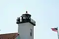 The Sand Point Lighthouse is a story-and-a-half rectangular building with an attached brick tower. The tower is topped with a cast iron lantern room which houses a fourth order Fresnel lens, emitting a fixed red light with a radiating power of 11.5 miles (18.5 km). A unique distinction concerning the Sand Point Lighthouse is that it was constructed with its tower facing the land instead of facing the water. Whether this orientation was intentional or an engineering blunder is unknown.