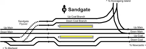 A one kilometre branch diverged behind the station in a north-westerly direction for Sandgate Cemetery. This closed on 13 October 1985.[5][6] Following the completion of the Sandgate Flyover in November 2006, Sandgate station is flanked by two coal lines on either side.[7]