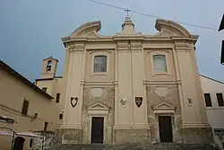 The baroque-style church standing alongside was built during 1739-1743 using a design by the then papal architect Ferdinando Fuga. The project aimed to enlarge the church of the convent. The site previously contained a medieval church of San Paolo and an Oratory of San Antonio. The two former structures, still evident in the stone around the portals and housing walled up oculi, were hidden behind the tall bipartite facade with giant order pilasters and an unusual tympanum. The tympanum recalls the church of the Babino Gesu all'Esquilino in Rome (now belonging to The Oblate Sisters of the Holy Child Jesus). The Roman church was completed in 1713 with a contribution also by Fuga.