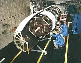 SCD-1 weighs approximately 110 kg and goes around the Earth every 100 minutes on a nearly circular orbit at about 760 km altitude.[4] The inclination of the orbit with respect to the plane of the equator is 25 degrees, providing excellent coverage of equatorial, tropical, and subtropical regions (up to about 35 degrees of latitude) around the world. The spin-stabilized spacecraft has the shape of an octagonal prism, with a diameter of 1 meter and a height near 70 cm without the antennas that are mounted on both base surfaces. It was originally designed for a life of one year with 80% probability, but it has survived 30 years in operation (as of 2023)[1] without any crippling functional failure. However, since its chemical (nickel-cadmium) batteries are now completely run down, the satellite can no longer be used while it is in the Earth's shadow.
