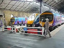 Scarborough, formerly Scarborough Central, is a Grade II listed[1] railway station serving the seaside town of Scarborough, North Yorkshire. It lies 42 miles (68 km) east of York and is one of the eastern termini on the North TransPennine route; it is managed by TransPennine Express.[2] and is also served by Northern Trains. The station is also at the northern end of the Yorkshire Coast line and is reputed to have the longest station seat in the world at 456-foot (139 m).[3]