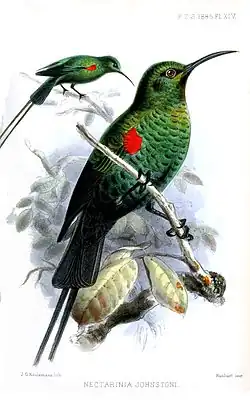 - ^ a b c BirdLife International (2018). "Nectarinia johnstoni". IUCN Red List of Threatened Species. 2018: e.T22717984A132115208. doi:10.2305/IUCN.UK.2018-2.RLTS.T22717984A132115208.en. Retrieved 12 November 2021.