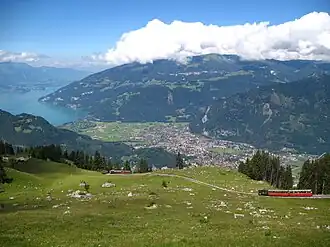 The line initially runs alongside the BOB for just over 0.5 km (0.31 mi) before crossing the Lütschine river and starting its climb up the valley side. Initially it passes through forest, with a passing loop at Rotenegg at an altitude of 886 m (2,907 ft). The forest is followed by alpine pastures which offer views of the Bernese Oberland including the town of Interlaken bracketed by Lake Thun and Lake Brienz. Another passing loop is located at Breitlauenen station, the line's only intermediate station at an altitude of 1,542 m (5,059 ft).[1][3]