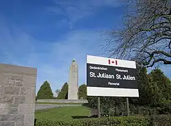 The village of St. Julien (now Sint-Juliaan; 50°53′24″N 2°56′13″E / 50.890°N 2.937°E) was in the rear of the 1st Canadian Division until the poison-gas attack of 22 April, when it became the front line. Some of the first fighting in the village involved the stand of Lance Corporal Frederick Fisher of the 13th Battalion CEF's machine-gun detachment; Fisher went out twice with a handful of men and a Colt machine gun, preventing advancing German troops from passing through St. Julien into the rear of the Canadian front line. He was killed the following day.[14]