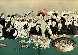 He chose horse racing[i. 3] as a way to enter high society.[16] In June 1900 he self-published his new album Le Turf of caricatures of many prominent Parisian socialites, including Marquess Boni de Castellane, Prince Trubetskoy, Count Clermont-Tonnerre, Baron Alphonse, Gustave de Rothschild, and Polaire.[16] The album's success made him famous overnight.[17] In October 1900 he published the album Paris-Trouville with equal success. Goursat published nine other albums before 1913.[18]