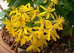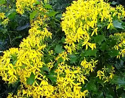 Senecio tamoides, also known as Canary creeper,[3] is a climbing member of the genus Senecio of the family Asteraceae that is native to Southern Africa.[4] It is used as an ornamental plant for its showy yellow, daisy-like flowers in late autumn through to winter.[5][6] Other names for the plant include golden shower vine,[7] false grapevine,[8] and parlor ivy.[9]
