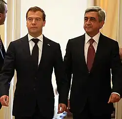 Sargsyan continued the policy towards the peaceful resolution of the Nagorno-Karabakh conflict pursued by his predecessors, which constitutes one of the main goals of the Armenian foreign policy.[38] Sargsyan repeatedly stated that the Armenian side is interested in finding a just and exclusively peaceful solution to the conflict and that the OSCE Minsk Group is the viable format within which the peace talks should continue.[39][40][41] He continued negotiations with Azerbaijan and had a number of meetings with the president of Azerbaijan within the framework of OSCE Minsk Group. On 2 November 2008, Ilham Aliyev and Serzh Sargsyan traveled to Moscow for talks with Dmitry Medvedev. The talks ended in the three Presidents signing a declaration confirming their commitment to continue talks.[42] The two presidents met again in 2009 in Saint Petersburg[43] and on 22 November 2009, together with several world leaders, in Munich where President Aliyev once more threatened to resort to military force to reestablish control over the region if the two sides did not reach an agreeable settlement.[44]