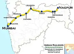 The 12139/12140 Sewagram Superfast Express runs via Kalyan Junction, Nashik Road, Bhusaval Junction, Akola Junction, Badnera Junction, Wardha Junction to Nagpur Junction.