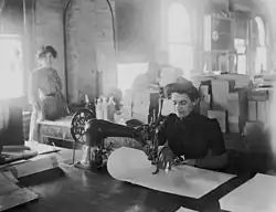 While much clothing was still produced at home by female members of the family, more and more ready-made clothes for the middle classes were being produced with sewing machines. Textile sweatshops full of poorly paid sewing machine operators grew into entire business districts in large cities like London and New York City. To further support the industry, piece work was done for little money by women living in slums. Needlework was one of the few occupations considered acceptable for women, but it did not pay a living wage. Women working from home often worked 14-hour days to earn enough to support themselves, sometimes by renting sewing machines that they could not afford to buy.[16]