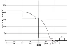 Braking curve for the original ATC-1 used on the Tokaido Shinkansen (Vertical axis represents the speed of the train whereas the horizontal axis represents the distance.)