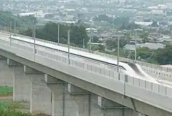 A combination of ballasted and slab track is used, with slab track exclusively employed on concrete bed sections such as viaducts and tunnels. Slab track is significantly more cost-effective in tunnel sections, since the lower track height reduces the cross-sectional area of the tunnel, reducing construction costs up to 30%.[34] However, the smaller diameter of Shinkansen tunnels, compared to some other high-speed lines, has resulted in the issue of tunnel boom becoming a concern for residents living close to tunnel portals.