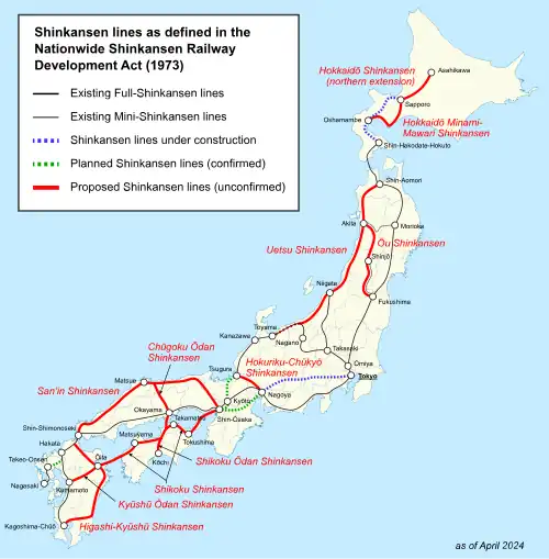 Map of Shinkansen lines (as of May 2024, excluding the Hakataminami Line and Gala-Yuzawa Line extension). The section of the Nishi-Kyushu Shinkansen west of Takeo-onsen utilizes a cross-platform interchange with conventional express trains due to the suspension of the GCT development.
