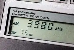 Portable shortwave receiver's digital display tuned to the 75–meter band