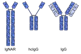 The first single-domain antibodies were engineered from heavy-chain antibodies found in camelids at the Université Libre de Bruxelles; these are called VHH fragments. Cartilaginous fishes also have heavy-chain antibodies (IgNAR, 'immunoglobulin new antigen receptor'), from which single-domain antibodies called VNAR fragments can be obtained.[2] An alternative approach is to split the dimeric variable domains from common immunoglobulin G (IgG) from humans or mice into monomers. Although most research into single-domain antibodies is currently based on heavy chain variable domains, Nanobodies derived from light chains have also been shown to bind specifically to target epitopes.[3]