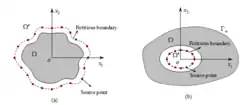 The methodology of the SBM was firstly proposed by Chen and his collaborators in 2009.[8][9] The basic idea is to introduce a concept of the origin intensity factor to isolate the singularity of the fundamental solutions so that the source points can be placed directly on the real boundary. In comparison, the method of fundamental solutions requires a fictitious boundary for placing the source points to avoid the singularity of fundamental solution. The SBM has since been successfully applied to a variety of physical problems, such as potential problems,[10][11] infinite domain problem,[12] Helmholtz problem,[13] and plane elasticity problem.[14]