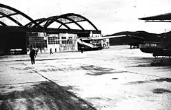 German water airport efforts in Northern Norway originally centered around their own plans for Billefjord Airport and Sørreisa Airport. However, with the onset of the fall storms, the Luftwaffe realized the favorable location of Skattøra. From 1941 they therefore resumed the Norwegian plans for completing the air station. Work progressed with limited supplies and those needed for the Polar Line were cannibalized to give way for the airport's completion.[15] From 5 July the workforce was supplemented and later dominated by Eastern European prisoners of war (POW), mostly from Yugoslavia and the Soviet Union. As of 1 January 1943 there were 441 POWs in Tromsø, most of which were working at Skattøra. By 1 April 1945 the number had increased to 1,325, of which 661 were working at Skattøra. Eighteen POWs died in Tromsø during the war.[16]