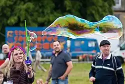 A soap bubble (commonly referred to as simply a bubble) is an extremely thin film of soap or detergent and water enclosing air that forms a hollow sphere with an iridescent surface. Soap bubbles usually last for only a few seconds before bursting, either on their own or on contact with another object. They are often used for children's enjoyment, but they are also used in artistic performances. Assembling many bubbles results in foam.