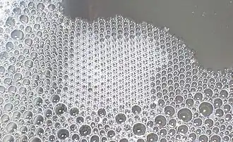 When a soap bubble is in contact with a solid or a liquid surface wetting is observed. On a solid surface, the contact angle of the bubble depends on the surface energy of the solid.[7][8] A soap bubble has a larger contact angle on a solid surface displaying ultrahydrophobicity than on a hydrophilic surface – see Wetting. On a liquid surface, the contact angle of the soap bubble depends on its size - smaller bubbles have lower contact angles.[9][10]