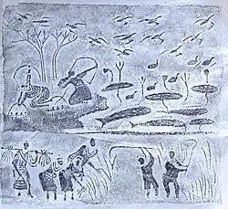 There were many amusements in the cities which could attract audiences rich and poor, such as trained animals performing tricks, cockfighting and caged animal fights between tigers, horse racing, puppet shows, musical performances with dancing, acrobatic feats, and juggling.[131] Wealthy families could afford their own house choirs and five-piece orchestras with bells, drums, flutes, and stringed instruments.[132] Gambling and board games such as liubo also provided entertainment.[133]
