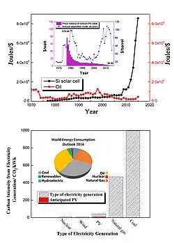 Energy volume of silicon solar cells and oil harnessed by human beings per dollar; carbon intensity of some key electricity generation technologies[39]