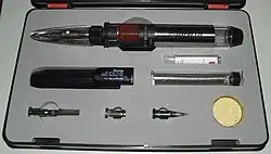 The first electric soldering iron had a very lightweight platinum tip heated by electric current flowing through the tip itself.[6] By 1889, electric soldering irons were being developed with a resistance wire wrapped around the back end of the copper head and enclosed in a protective shell.[7] Alternatively, the heating element could be enclosed in a relatively light-weight hollow copper head.[8]
