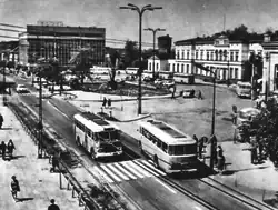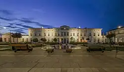 In 1860, the Russian architect A. I. Gornostayev constructed customs buildings on the opposite side of the tracks, later demolished in the Interwar period.[13] The station's establishment spurred Sosnowiec's rapid development, leading to the construction of public facilities (banks, hotels, commercial and service buildings), and residential structures, which contributed to receiving city rights from Tsar Nicholas II in 1902.[11][12]