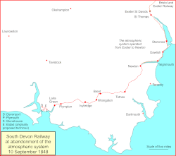 On 18th August a goods train of eleven trucks, weighing 120 long tons (122 t; 134 short tons), travelled the 8+14 miles (13.3 km), Exeter to Starcross, in 15 minutes.[note 8] On 8th September 1847, besides the usual service of trains hauled by locomotives, four extra ones commenced running, these being propelled by the atmospheric system. This was the first public use of the system on the South Devon Railway. Although the line was opened as far as Newton Abbot, between that station and Teignmouth locomotives were employed, but the piston carriage on the down train went on to Newton, where it was taken off with the superfluous carriages and placed on a convenient line to be attached to the up train when required, so that, on arriving at Teignmouth, where the locomotive was removed, the piston carriage started the train when the signal was given.[14]