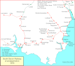 Shortly after the amalgamation the London and South Western Railway (LSWR) arrived in Plymouth and a joint station was opened at North Road. The LSWR had long wished to reach Devon and Cornwall, but its early aspirations had been frustrated, and it was not until 1860 that it reached Exeter. Gradual extensions, in some cases using nominally independent promoters, resulted in its reaching Lidford (spelt Lydford from 1897) on 12 October 1874. The Launceston and South Devon Railway had been absorbed by the South Devon Railway in 1869, but under the terms of the Launceston and South Devon Railway Act 1862 it was required to lay 'narrow gauge'[note 13] rails when requested by any connecting narrow gauge line.[33] Consequently, the SDR had to lay a narrow gauge rail, forming mixed gauge track, from Lidford to Plymouth, and to allow LSWR trains to run over the line. However the SDR managed to prevaricate and delay the actual running of the LSWR trains to Plymouth until 17 May 1876.
