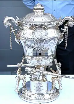 The trophy was awarded annually to ships in the Pacific and Atlantic Fleet until it was retired in 1941, prior to World War II, and placed on display for many years at the Naval Museum in Washington D.C. before being moved to the Naval Historical Center in the Washington Navy Yard in 1977. In 1984, the Spokane Trophy was reactivated and sent to the U.S. Pacific Force Headquarters in San Diego. In keeping with historic tradition, the trophy, now worth nearly $4 million, is annually awarded to the United States Pacific Fleet surface ship that demonstrates overall excellence in combat systems and warfare readiness. The trophy has been awarded forty-two times to thirty-one different ships. In 2007 the trophy was awarded to the USS Chafee, an Arleigh Burke-class Aegis destroyer homeported in Hawaii. USS Hopper was the 2008 Spokane Awardee, and is also homeported in Pearl Harbor, Hawaii. The officers and crew of guided-missile destroyer USS Curtis Wilbur, forward-deployed to Commander Fleet Activities Yokosuka, learned their command was announced as the 2009 Spokane Trophy recipient on April 15, 2010.[5] In 2011 USS Sampson, homeported in San Diego, won the trophy.[6] In 2013 it was USS Mobile Bay, also homeported in San Diego, that won it. The trophy was awarded in 2014 to the USS Preble, homeported in San Diego, CA. In 2016 it was awarded to the USS Chancellorsville, the second time the ship had received "this prestigious award".[7]